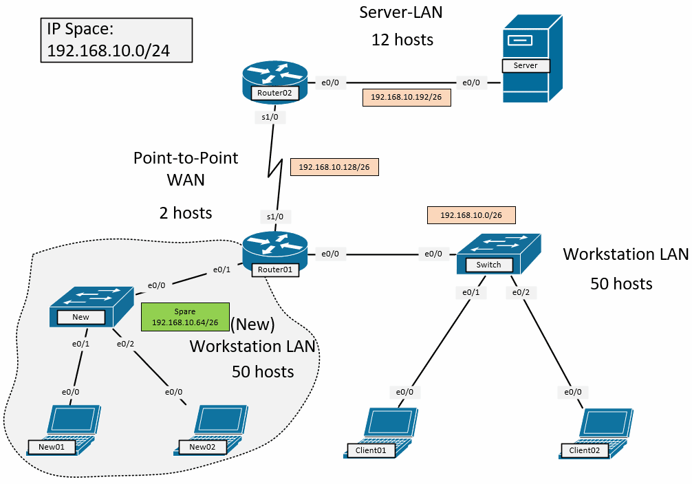 - Point-to-Point WAN: di kaki s1/0 Router01 menuju kaki s1/0 Router02, cuma butuh 2 hosts.